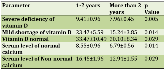Introduction Vitamin D is one of the fat-soluble vitamins that plays an important role in the body, which involves maintaining the health of bone, teeth and joints and helping the function of the immune system. This vitamin is found in certain foods, but in the body, in the event of exposure to the sun [1]. Symptoms of vitamin D deficiency are bone pain and muscle weakness to reduce and weak immune system [2]. While prolonged shortages can cause abdominal obesity, increased blood pressure, psoriasis, osteoporosis, chronic fatigue, Alzheimer's disease, cancer and type of type 2. Vitamin D helps improve insulin sensitivity - a hormone responsible for adjusting blood glucose levels - and thus reduces the risk of insulin sensitivity, which is often a background for type 2 diabetes [3, 4]. Some researchers believe that this vitamin may help the production of insulin in the pancreas. In the ideal state of vitamin D levels should be between 20 and 56ng/ml, each of which is less than this rate as vitamin D deficiency. It is also taken. It is now clear that increasing vitamin D in the body of 60 to 80ng/ml contributes to blood glucose control, which is essential for people with diabetes [5, 6]. At the same time, with the effect of effective vitamin D receptors on insulin secretion, vitamin D also stimulates the receptors affecting insulin sensitivity [7]. Due to a complex physiological process, interference and binding between these receptors increases the number of insulin receptors in the body [8]. It gives such vitamin D to insulin sensitivity by activating the receptors to regulate the metabolism of fatty acids in the muscles and body fat. According to the relationship between vitamin D and calcium and insulin secretion, the presence of calcium for the muscles. And the fat reaction to insulin is essential that causes insulin and glucose and without vitamin D, there will be no calcium [9, 10]. Study results showed that people who receive high levels of vitamin D decreased by 43% diabetes mellitus, as well as another study showed that higher levels of vitamin D in mice were associated with a decrease in the prevalence of type 2 diabetes [11]. Due to the fact that vitamin D and calcium in diabetes can play a major role in diabetes, and informed of preventive measures, the present study aims to serum calcium and vitamin D Status in Patients with Type 2 Diabetes was done. Instrument and Methods Study design This descriptive study was conducted during 2018 with participation of 122 children with type 2 diabetes. Sampling by non-probable and ready-made method was conducted by examining the records of patients with diabetes referring to the office of the physicians of the children of Tabriz University of Medical Science. Entry and exit criteria The criteria for entering the study included: children in two to 8 years, referring to the expertise of endocrine expertise, satisfaction with participation in the study. Exit criteria included: consumption of supplements containing calcium and vitamin D, history of liver and kidney disease, history of reacting, history of dialysis and the history of malignant cancers. Clinical, anthropometric and biochemical evaluation Age, sex, duration of diabetes, other diseases (based on the information contained in the case) and the anthropometric characteristics of individuals including height, weight and body mass index by nutrition, review, and in The information form was recorded. To evaluate biochemical indices (vitamin D and calcium), 100cc blood from patients in fasting state was taken by the expert in the laboratory. Blood samples were transferred to the laboratory in less than an hour at a temperature of 2 to 8°C and immediately centrifuge in the laboratory. Serum was detached until the checkout at a negative temperature of 8°C was kept. Ethical Considerations This study was conducted after approval in the Ethics Committee of Tabriz University of Medical Sciences (ir.tbzmed.rec.1397.870). For vitamin d and calcium tests, no cost was received; Patient parents signed consciously informed consent after explaining the goals of the research and awareness of this study. Statistical analysis Data were analyzed by clinical, anthropometric and biochemical studies in SPSS 21 software. Kolmogorov-Smirnov test was performed. The mean and standard deviation and frequency of sex were calculated and Pearson correlation test was used to analyze the data. Findings The average age of participants in the study was 5 years. The majority of them (75) were girls and the body mass index was all participants in the overweight range. The mean serum calcium level was 9.45±0.85mg/dl and the average serum levels of vitamin D were 10.99±1.14ng/ml. Serum vitamin D levels were divided into three levels of severe deficiency, mild and natural deficiency; Also, serum calcium levels were divided into two normal and abnormal levels. Body mass index and diabetes time based on vitamin d and calcium group showed a significant difference between groups; This means that the low serum levels of vitamin D and calcium are predictors of diabetes in children (Table 1). The relationship between the duration of diabetes and serum levels of vitamin d and serum calcium levels indicated that the severity of vitamin D and calcium was lower, the duration of diabetes is also higher (Table 2). Table 1) Comparison of serum vitamin D and calcium levels based on body mass index in participants in study Table 2) Comparison of serum vitamin D and calcium levels based on duration of diabetes Discussion Many topics about calcium have been published recently. Some of this news is about calcium intake, such as the link between heart disease and calcium overdose, but it is better not to jump to conclusions and not to rule out calcium supplements [12]. Calcium is one of the most abundant minerals in the body and is responsible for the strength of bones and teeth, as well as in functions such as hormone transfer, nerve cond